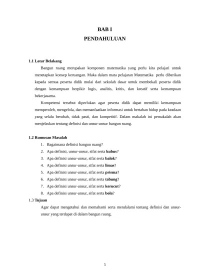 Makalah Bangun Ruang - 1 - Ada banyak macam bangun ruang, diantaranya adalah limas segi empat, tabung, kerucut, balok, kubus, dan prisma.. Diajukan guna memenuhi tugas mata kuliah pendidikan matematika yang dibina oleh dra. Makalah ini dibuat untuk menyelesaikan tugas akhir mata kuliah konsep. Pelajaran ini sudah diajarkan sejak tingkat sekolah dasar hingga sekolah menengah atas. Berdasarkan latar belakang dapat diperoleh rumusan masalah yaitu. Bangun ruang merupakan sebuah bangun yang memiliki ruang yang dibatasi .